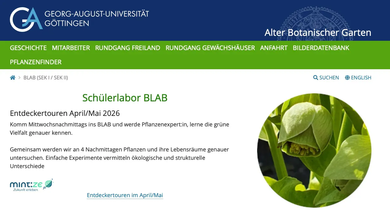 Das BLAB der Universität Göttingen ist ein außerschulischer Lernort für Schüler:innen der Sekundarstufen, der Einblicke in aktuelle Fragestellungen der Biodiversitätsforschung bietet. Im Mittelpunkt stehen praxisnahe, forschende Zugänge, bei denen biologische, ökologische und gesellschaftliche Zusammenhänge im Sinne der Bildung für nachhaltige Entwicklung (BNE) erfahrbar werden. So untersuchen Schüler:innen beispielsweise Anpassungen von Pflanzen an unterschiedliche Lebensräume oder analysieren Gewässer und ihre ökologische Qualität. In mehrtägigen Projekten entwickeln sie zudem eigene Ideen für nachhaltige Stadtentwicklung oder setzen sich mit den Auswirkungen des Klimawandels auseinander. Die Angebote verbinden wissenschaftliches Arbeiten mit aktuellen Nachhaltigkeitsthemen und ermöglichen vertiefende Einblicke über den Unterricht hinaus.